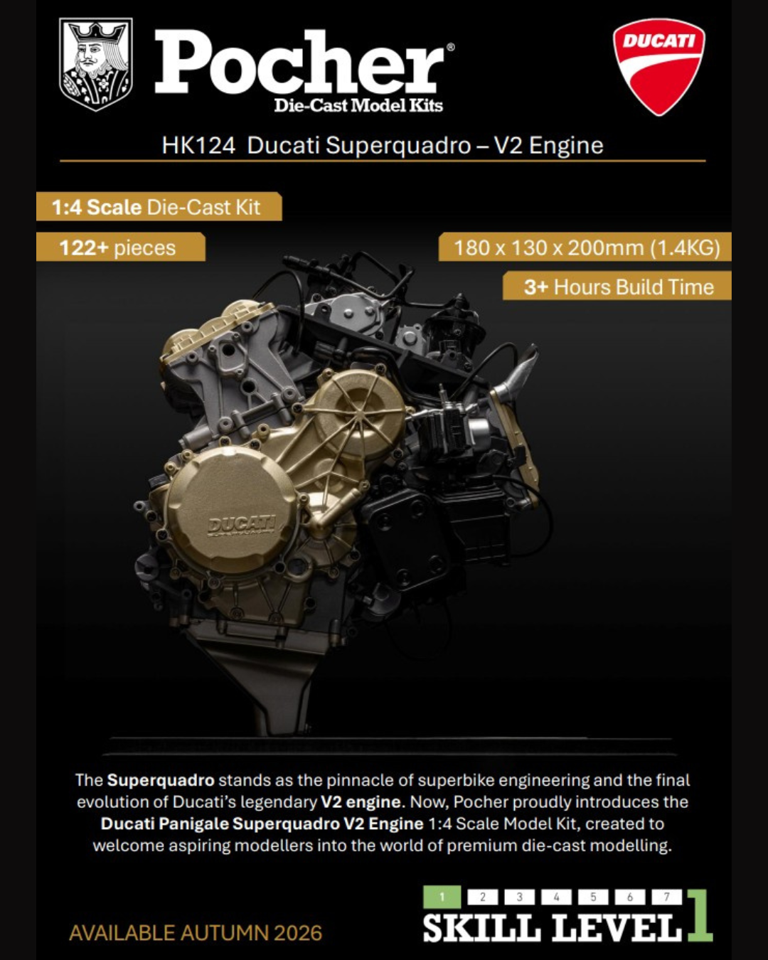 Pocher introduceert een nieuw model voor liefhebbers van Ducati en modelbouwers van alle niveaus: de Ducati Panigale Superquadro V2 Engine. Deze kit legt volledig de focus op het technische hart van Ducati’s superbike-engineering: de iconische Superquadro V2-motor.